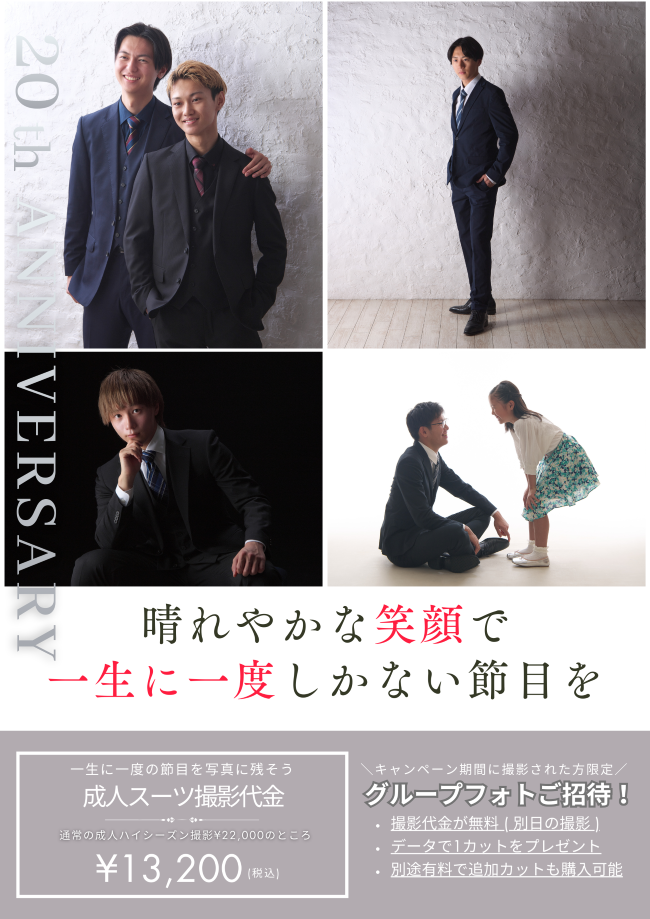 男性・スーツでの成人記念撮影キャンペーンを実施いたします。