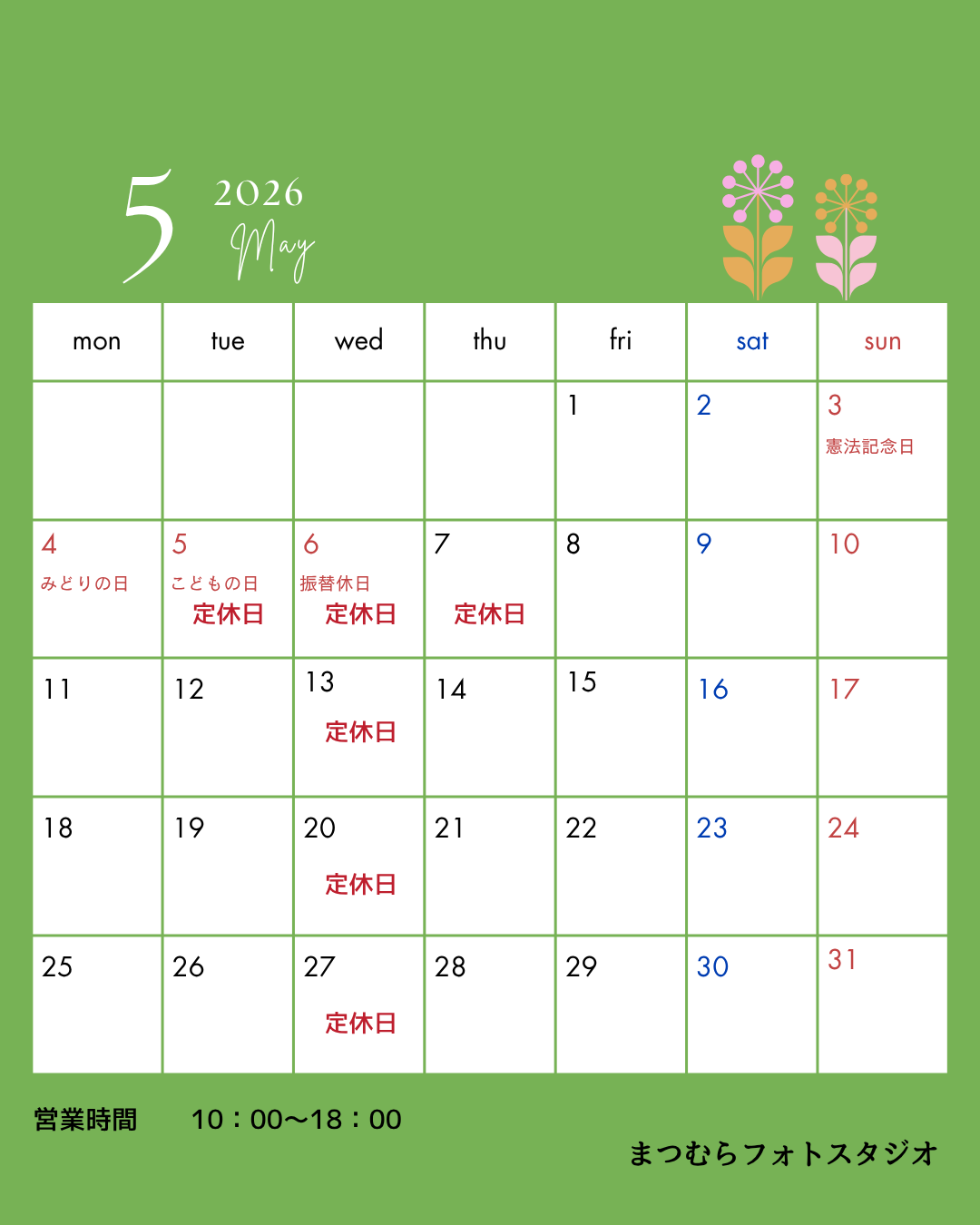 [休業日]5.6.7.13.20.27